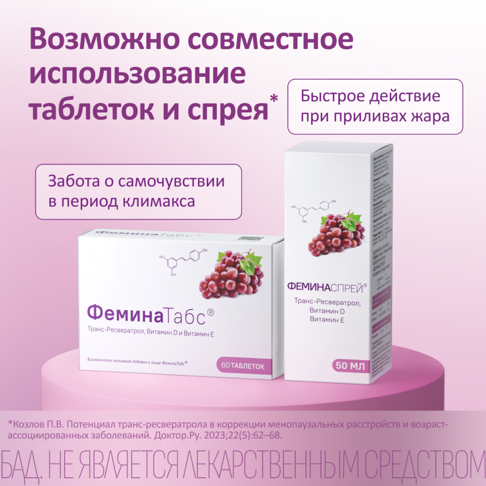 ФеминаТабс® содержит транс-ресвератрол, который лучше и быстрее всасывается и, в сравнении с другими фитоэстрогенами, способен связываться cо всеми видами эстрогеновых рецепторов (как с бета-, так и с альфа-), что позволяет оказывать полный спектр эстрогеноподобных эффектов.