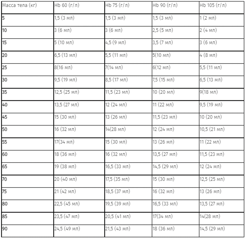 Дети с массой тела 5-10 кг: 1 мл (1/2 ампулы = 50 мг железа).