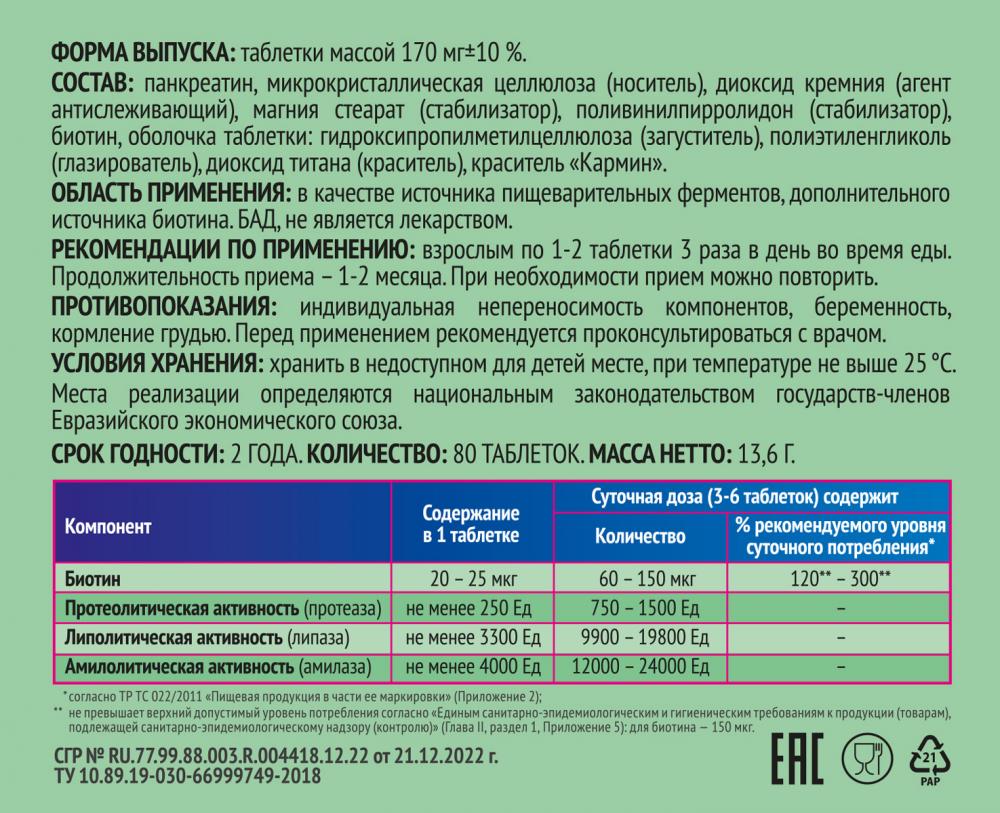 Панкреатин, микрокристаллическая целлюлоза (носитель), диоксид кремния (агент антислеживающий), магния стеарат (стабилизатор), поливинилпирролидон (стабилизатор), биотин, оболочка таблетки: гидроксипропилметилцеллюлоза (загуститель), полиэтиленгликоль (глазирователь), диоксид титана (краситель), краситель «Кармин».