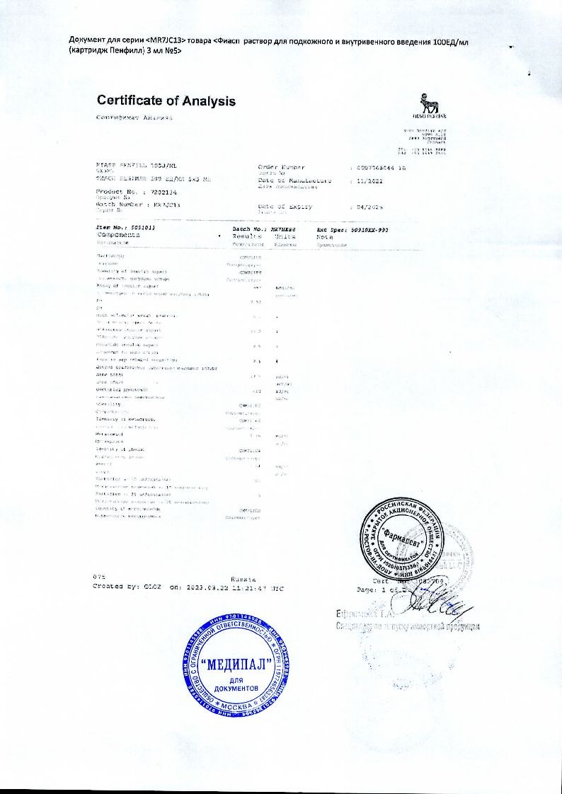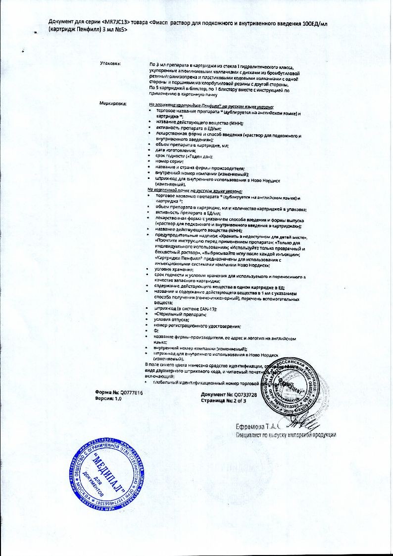 1 картридж Пенфилл® содержит 3 мл раствора, что эквивалентно 300 ЕД.