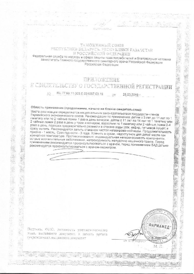Порошок следует развести в стакане воды или напитка (сок, кефир, питьевой йогурт), подождать минуту, перемешать и выпить. Запить стаканом чистой негазированной воды.