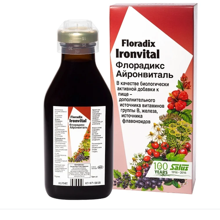 Флорадикс Айронвиталь – это натуральный витаминизированный тоник, обладающий приятным фруктовым вкусом, который прекрасно зарекомендовал себя при состояниях дефицита железа в организме (в том числе при железодефицитной анемии), для поддержания здоровья и хорошего самочувствия у спортсменов, активно растущих подростков и пожилых людей, а также при беременности и во время кормления грудью.