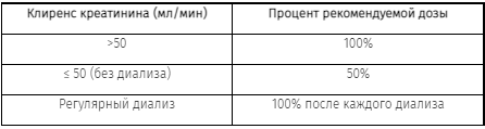 Пациенты, находящиеся на регулярном диализе, должны получать 100% рекомендуемой дозы после каждого сеанса диализа. В день, когда диализ не проводится, пациенты должны получать уменьшенную (в зависимости от клиренса креатинина) дозу препарата.