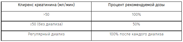 Пациенты, находящиеся на регулярном диализе должны получать 100% рекомендуемой дозы после каждого сеанса диализа. В день, когда диализ не проводится, пациенты должны получать уменьшенную (в зависимости от клиренса креатинина) дозу препарата. У детей с нарушением функции почек суточную дозу препарата следует уменьшить в той же пропорциональной зависимости, что и у взрослых), в соответствии со степенью выраженности почечной недостаточности.