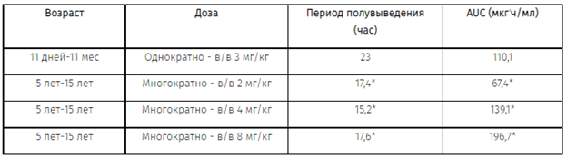 Детям в возрасте от 14 до 27 дней ту же дозу вводят с интервалом 48 ч (максимальная доза 12 мг/кг не должна быть превышена).