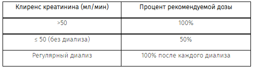 Пациенты, находящиеся на регулярном диализе, должны получать 100 % рекомендуемой дозы после каждого сеанса диализа. В дни, когда диализ не проводится, пациенты должны получать уменьшенную (в зависимости от клиренса креатинина) дозу препарата.