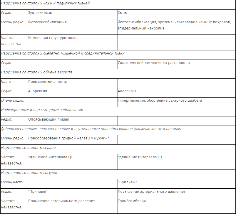По данным Всемирной организации здравоохранения нежелательные эффекты классифицированы в соответствии с их частотой развития следующим образом: очень часто (≥10%); часто (≥1% и <10%); нечасто (≥0,1% и <1%); редко (≥0,01% и <0,1%); очень редко (<0,01 %); частота неизвестна (недостаточно данных для оценки частоты развития).