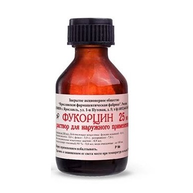 Активные вещества: борная кислота - 0,8 г, фенол - 3,9 г, резорцин - 7,8 г, фуксин основной - 0,4 г Вспомогательные вещества: ацетон - 4,9 мл, этанол 95 % (спирт этиловый 95 %) - 9,6 мл, вода очищенная - до 100 мл.