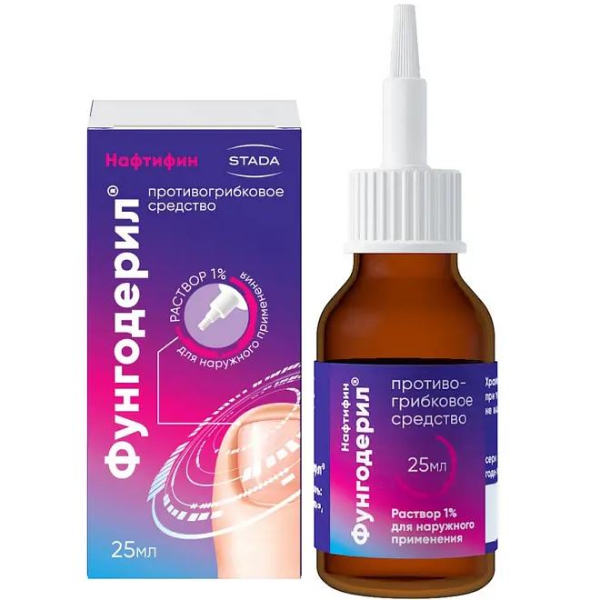 Фунгодерил содержит действующее вещество нафтифин, являющееся противогрибковым средством. Нафтифин в зависимости от вида грибка оказывает на грибок либо разрушающее, либо подавляющее его рост и размножение действие.