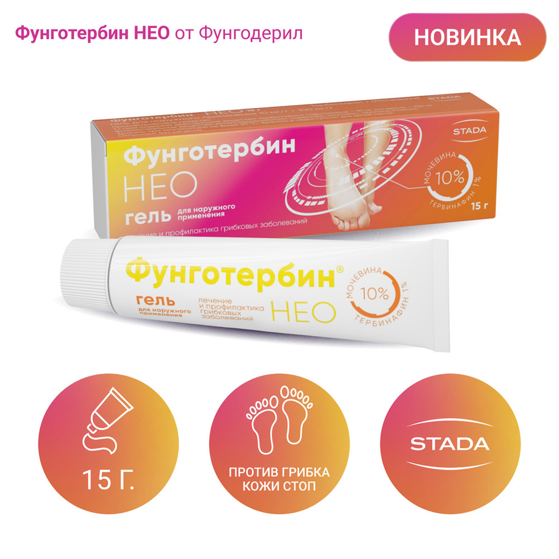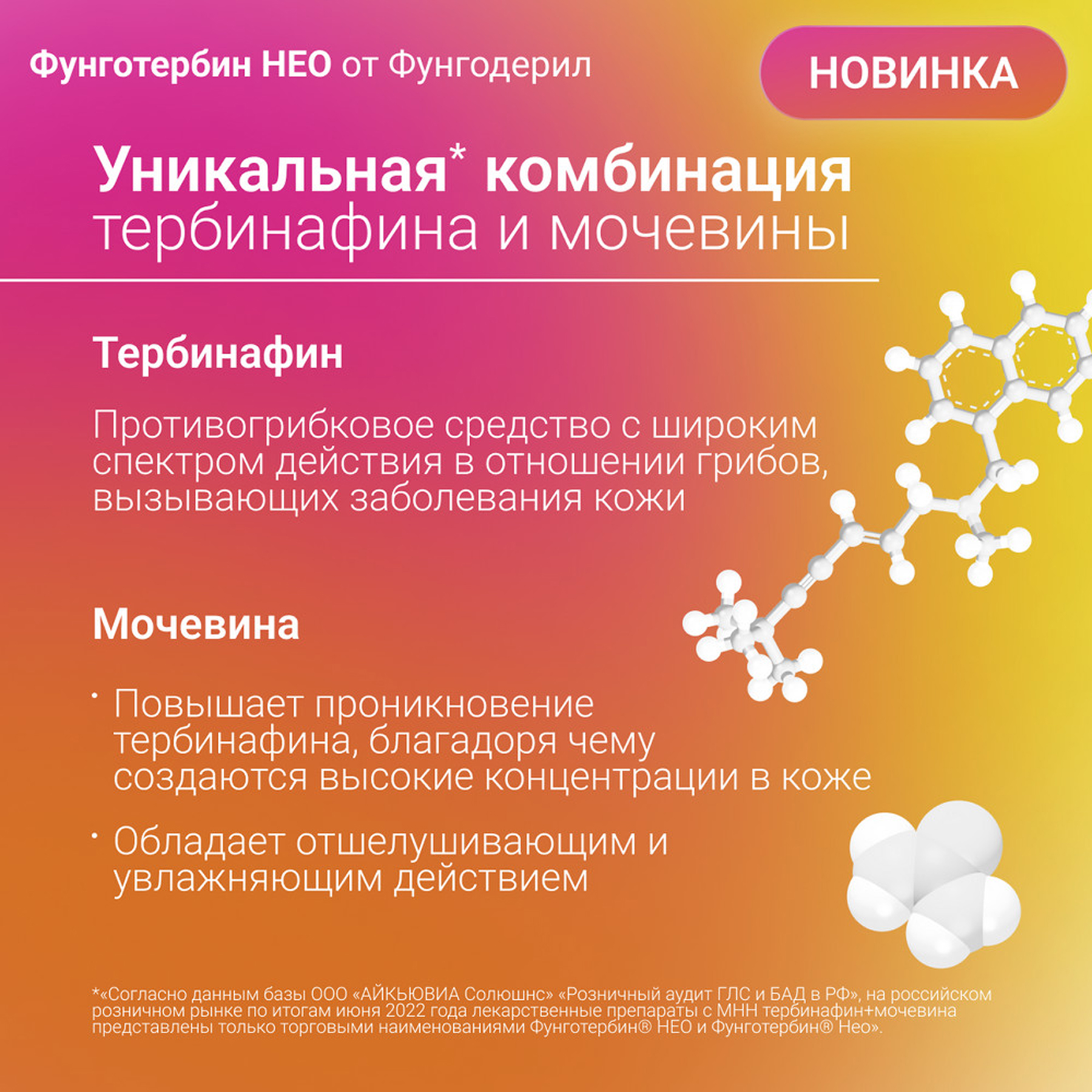 Мочевина - второй активный компонент Фунготербин® НЕО, обладает смягчающим, отшелушивающим и увлажняющим эффектом, способна повышать дерматопенетрантность (проникновение в кожу) и создавать высокие концентрации тербинафина в коже. Мочевина способствует связыванию воды и размягчению рогового слоя кожи.