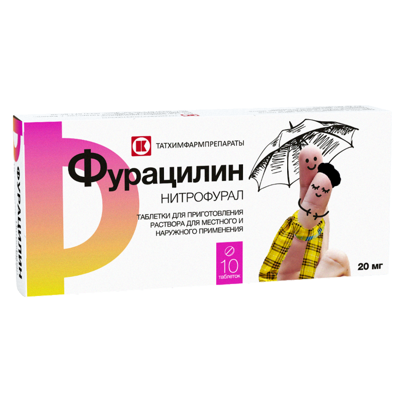 Местно, наружно в виде 0,02% свежеприготовленного водного раствора: непосредственно перед применением одну таблетку (20 мг фурацилина), растворяют в 100 мл дистиллированной или в теплой кипяченой воде. Для более быстрого растворения рекомендуется горячая вода. Затем раствор охлаждают до комнатной температуры.