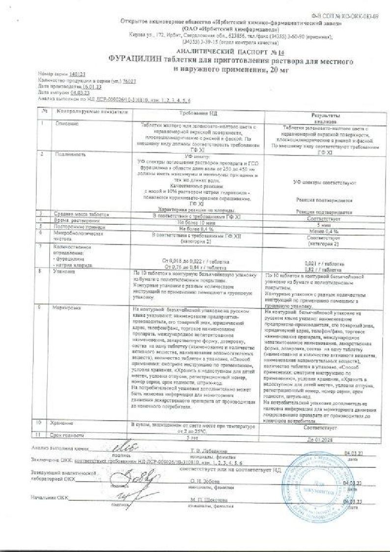 Взрослым, водный 0,02% раствор нитрофурала готовят непосредственно перед применением: 1 часть Фурацилина растворяют в 5000 частях дистиллированной воды или кипяченой воды. Для более быстрого растворения рекомендуется кипящая или горячая вода. Затем раствор охлаждают до комнатной температуры.