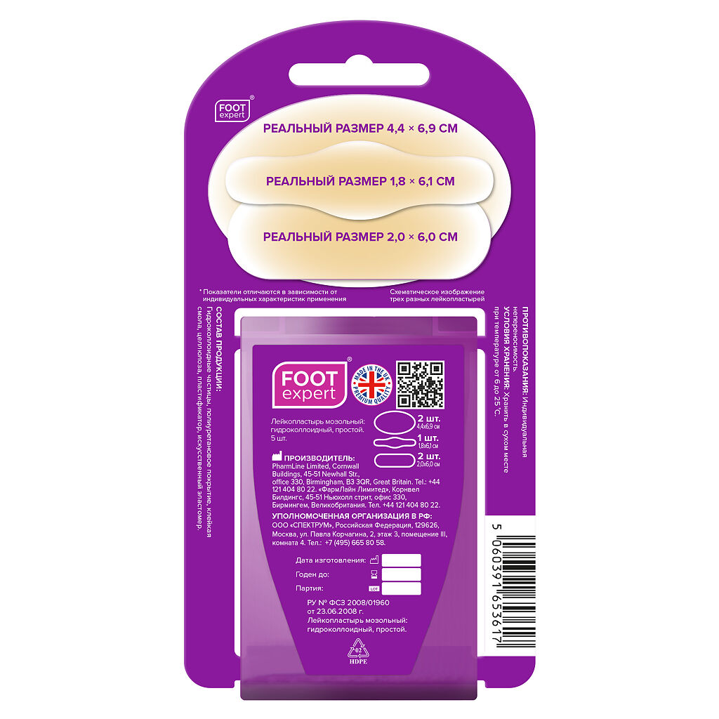 Foot Expert Набор гидроколлоидных лейкопластырей Размер 4,4х6,9 см - 2 шт. Размер 1,8х6,1 см - 1 шт. Размер 2,0х6,0 см - 2 шт. От влажных мозолей Количество в упаковке 5шт.