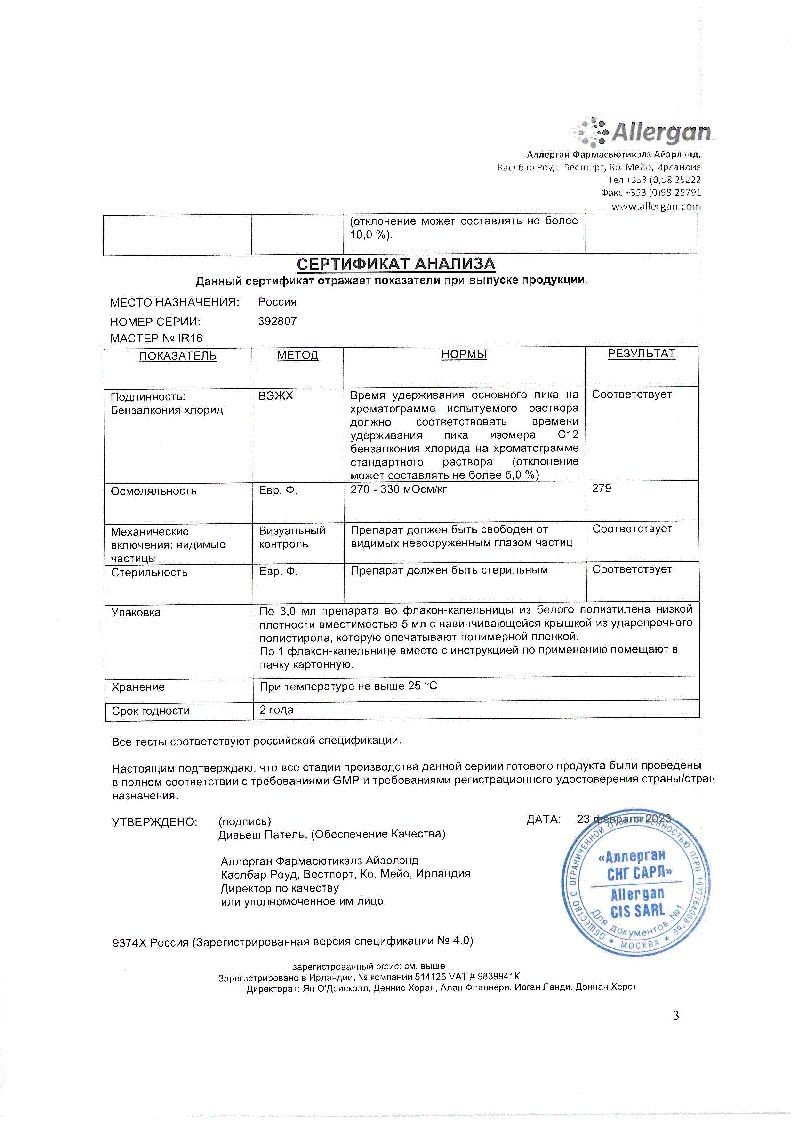 После вскрытия флакона нельзя исключить возможность микробной контаминации его содержимого, что может привести к воспалительным поражениям глаз. Срок годности препарата после первого вскрытия флакона составляет 28 суток. После истечения указанного времени флакон следует выбросить, даже если раствор полностью не использован.