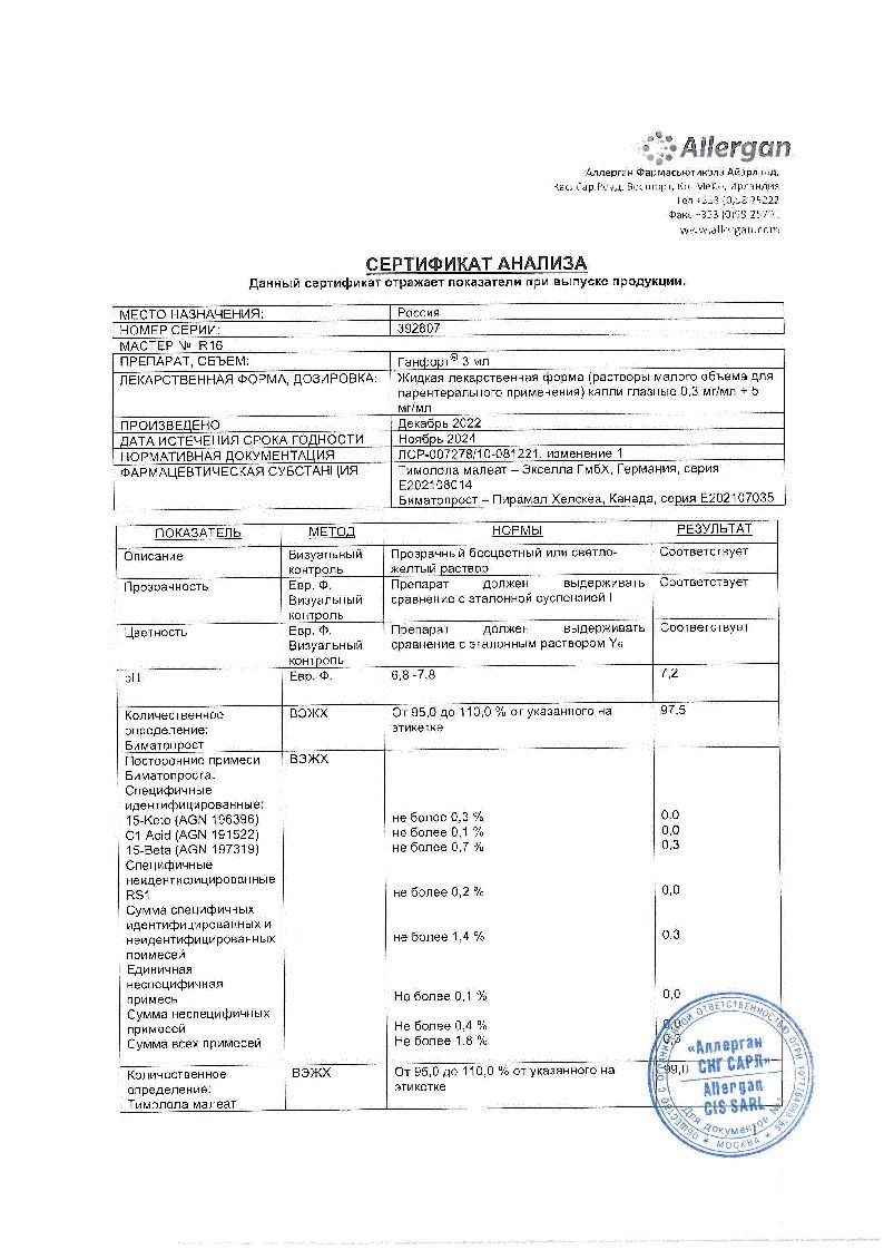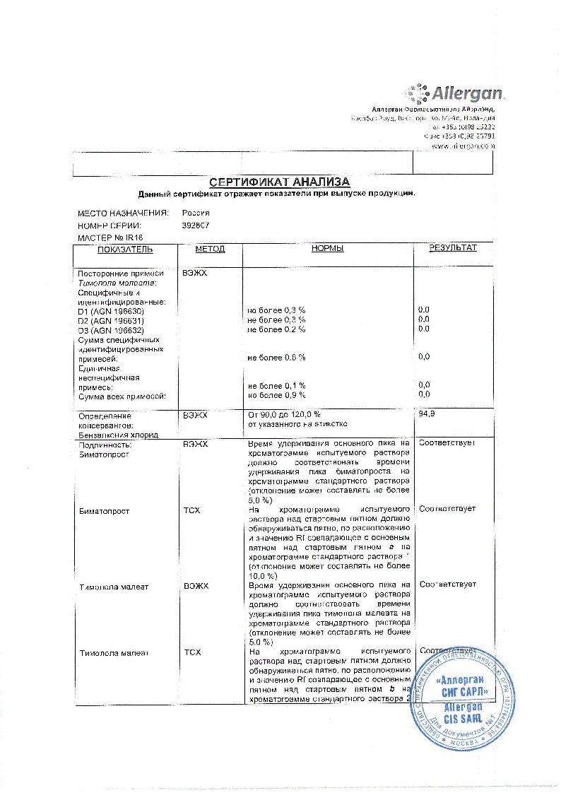 Действующие вещества: биматопрост - 0,3 мг/мл, тимолола малеат - 6,8 мг/мл (в пересчете на тимолол - 5,0 мг/мл).