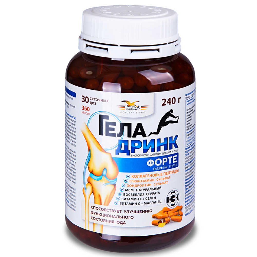 Геладринк Форте - содержит в своём составе комплекс хондропротекторов: пептидный коллагеновый гидролизат, глюкозамин и хондроитин сульфаты и метилсульфонилметан (МСМ), а также микро- и макроэлементы и важнейшие витамины, которые защищают и питают не только хрящевые ткани, но и всю связочно-суставную систему, способствуют улучшению подвижности суставов и позвоночника человека.Противопоказано при беременности и в период лактации.