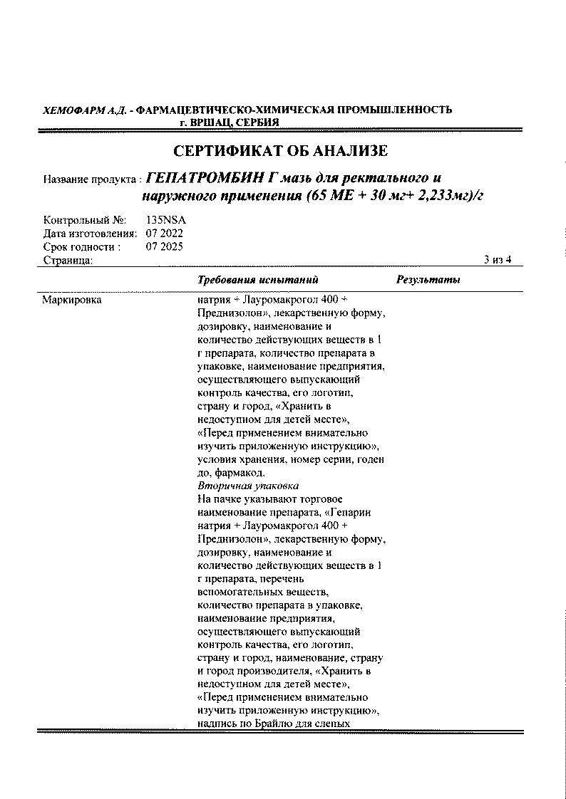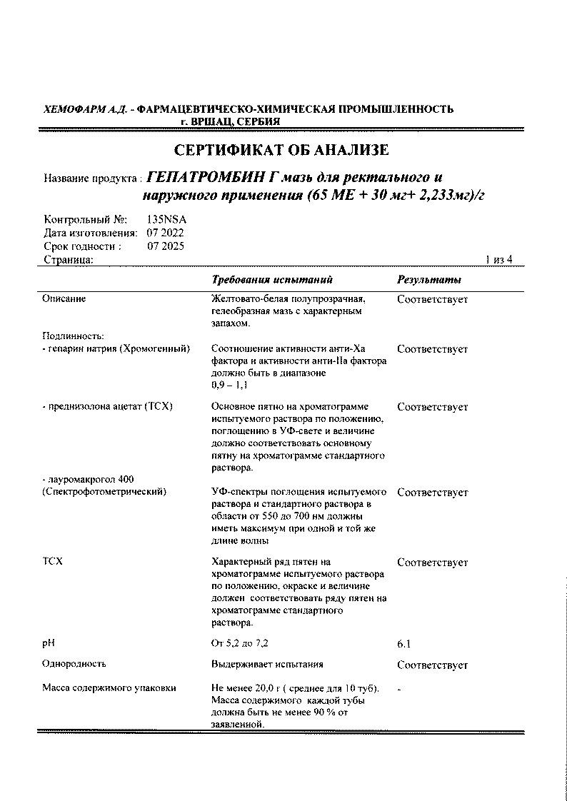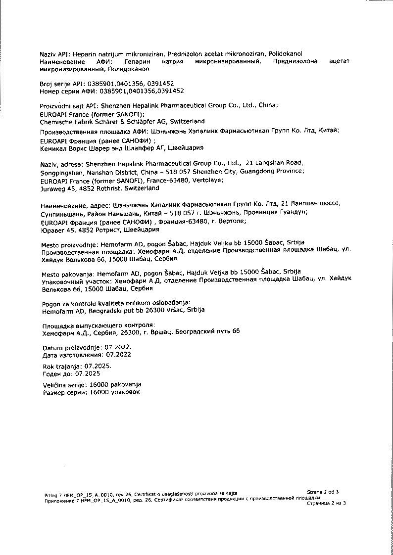 Активные вещества: гепарин натрия 65 МЕ*, преднизолона ацетат 2.233 мг, лауромакрогол 600 30 мг.