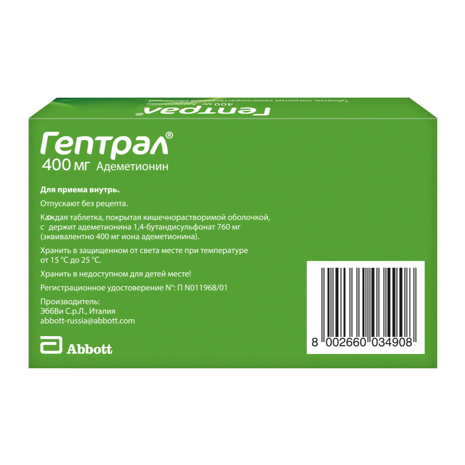 Препарат Гептрал® принимают внутрь. Таблетки следует принимать целиком, не разжевывая, желательно в первой половине дня между приемами пищи. Таблетки препарата Гептрал® следует вынимать из блистера непосредственно перед приемом внутрь. В случае если таблетки имеют цвет, отличный от белого до белого с желтоватым оттенком (вследствие негерметичности алюминиевой фольги), препарат Гептрал® применять не рекомендуется.