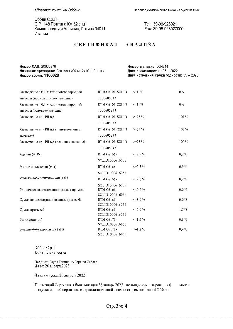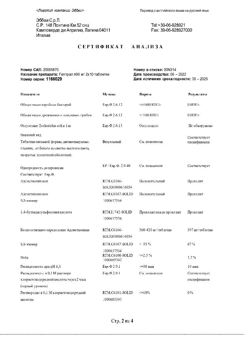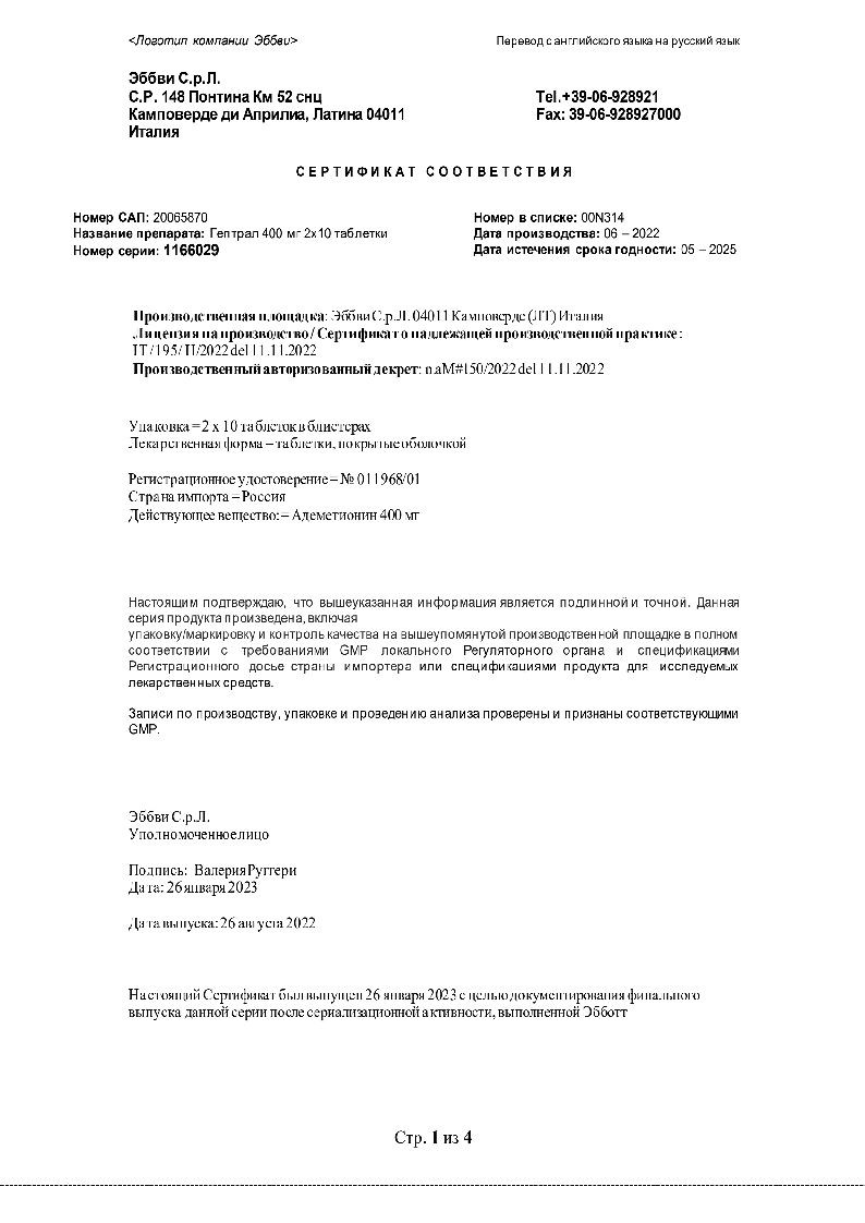 Каждая таблетка кишечнорастворимая, покрытая пленочной оболочкой, содержит 400 мг адеметионина (в виде адеметионина 1,4-бутандисульфонат 760 мг).