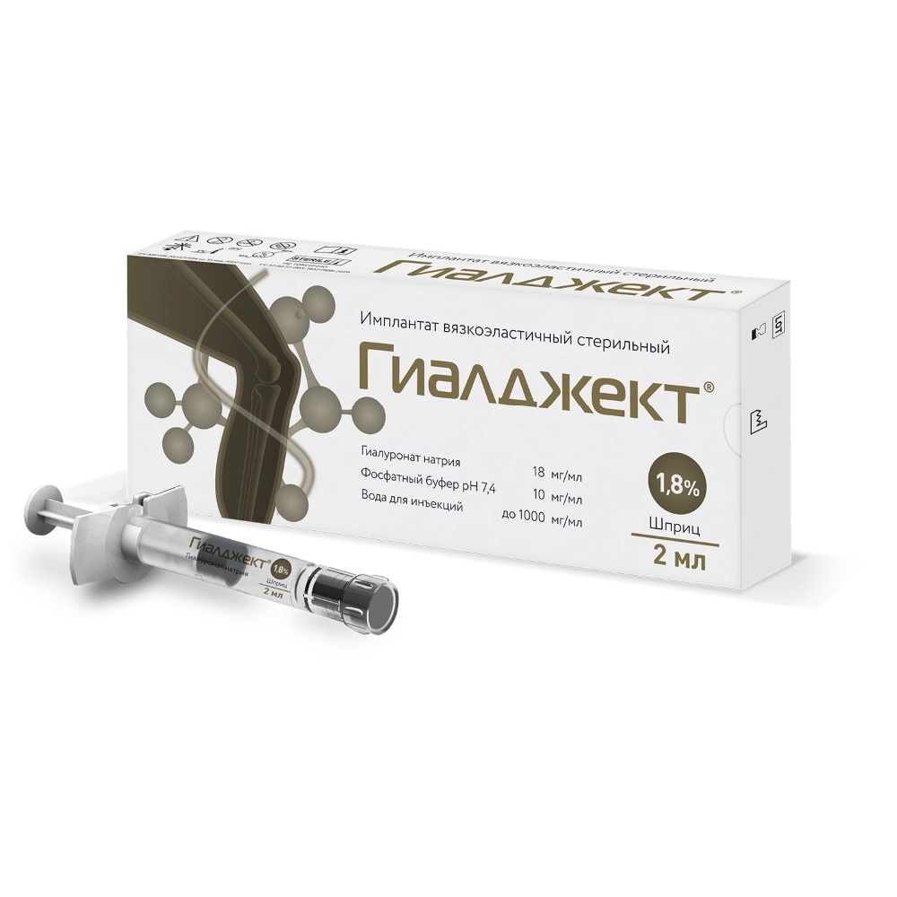 Вязкоэластичные свойства гиалуроновой кислоты, входящей в состав синовиальной жидкости, обеспечивают смазывание и амортизацию суставных поверхностей. Синовиальная жидкость в суставах при дегенеративных заболеваниях (остеоартроз) или травматических изменениях суставов, имеет более низкую вязкость и эластичность, чем в здоровых суставах. Гиалуроновая кислота, входящая в состав Импланта ГИАЛДЖЕКТ, имеет молекулярную массу 2,2 млн. дальтон, близкую к естественной гиалуроновой кислоте человека, и оказывает положительный эффект после введения при диагнозе остеоартроз (остеоартрит). Внутрисуставное введение Имплантата ГИАЛДЖЕКТ восстанавливает физиологические и реологические свойства синовиальной жидкости сустава, пораженного остеоартрозом. Вследствие этого уменьшается боль и дискомфорт, улучшается подвижность в суставе.