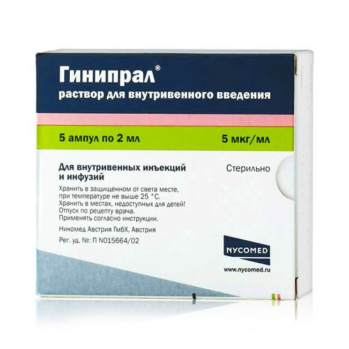 В начале лечение начинают с медленного болюсного введения 10 мкг (1 ампула по 2 мл) с последующей инфузией препарата Гинипрал® со скоростью 0,3 мкг/мин.