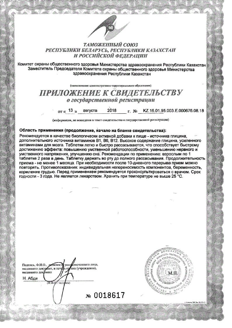 Впервые действие глицина усилено максимальной дозировкой витаминов B1, B6, B12 в таком соотношении, как они существуют в природе. Витамины группы В благотворно влияют на нервную систему, помогают противодействовать стрессу.