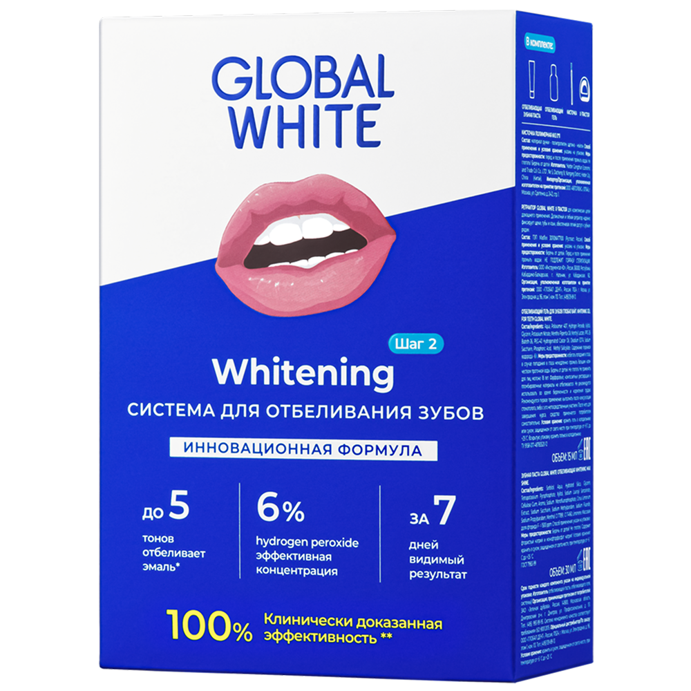 Комплекс средств для отбеливания зубов в домашних условиях аналогичный профессиональным системам отбеливания у стоматолога. Отбеливающий эффект клинически подтвержден испытательной лабораторией "Клиндерма". В течение одной недели зубы станут светлее на три тона, в течение двух недель - на четыре-пять тонов по шкале VITAPAN. Участники испытаний также отметили, что у них не появилось болезненных ощущений или повышенной чувствительности во время использования отбеливающей системы.