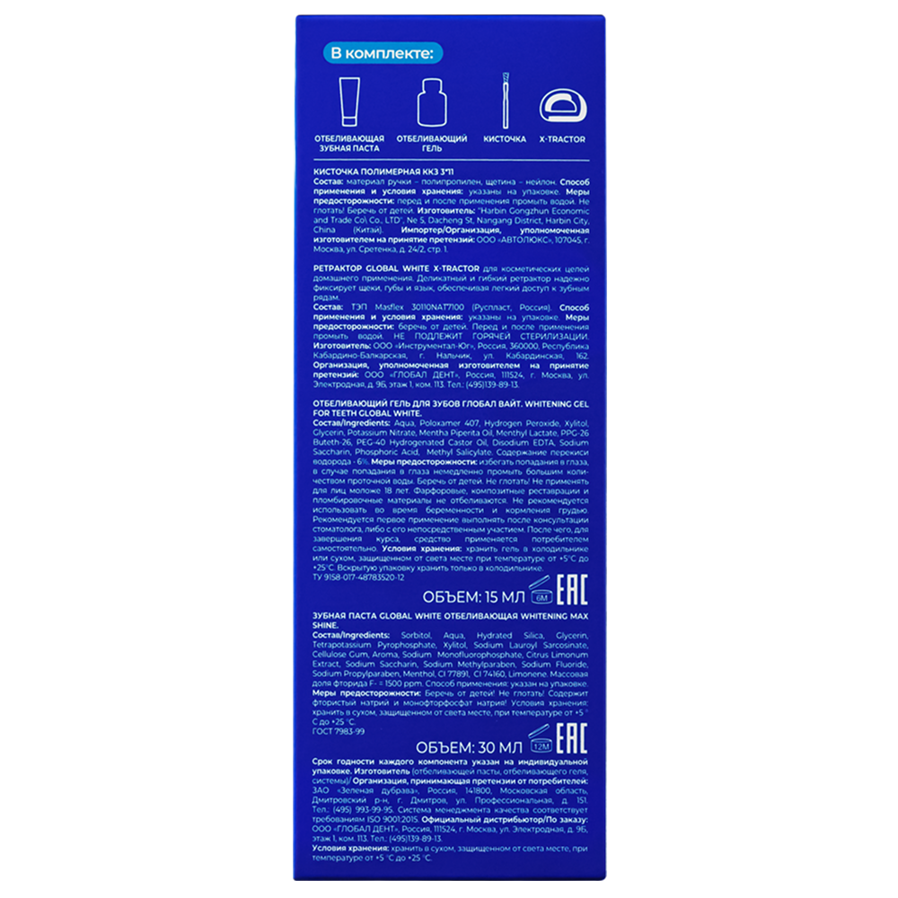 Отбеливающий гель: Aqua, Poloxamer 407, Hydrogen Peroxide, Xylitol, Glycerin, Potassium Nitrate, Mentha Piperita Oil, Menthyl Lactate, PPG-26 Buteth-26, PEG-40 Hydrogenated Castor Oil, Disodium EDTA, Sodium Saccharin, Phosphoric Acid, Menthyl Salicylate.