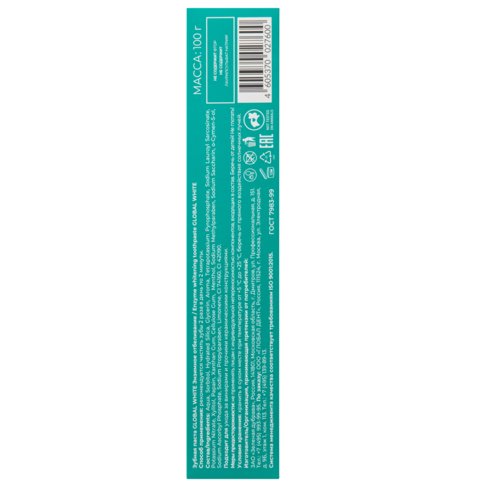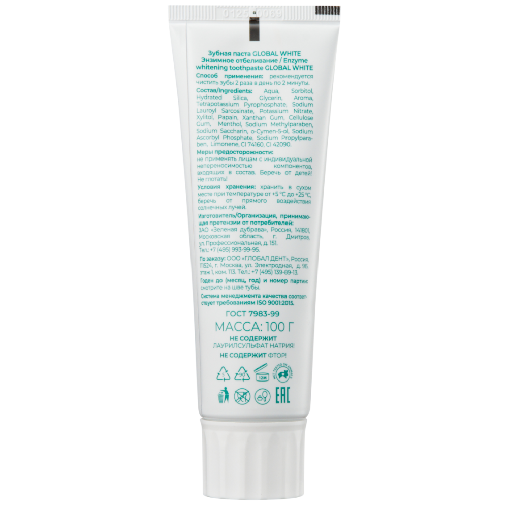 Необходимо чистить зубы 2 раза в день в течение 2 минут. Достаточно использовать небольшое количество зубной пасты. Для достижения максимального эффекта отбеливания рекомендуется также использовать отбеливающие полоски, системы и карандаши GLOBAL WHITE.