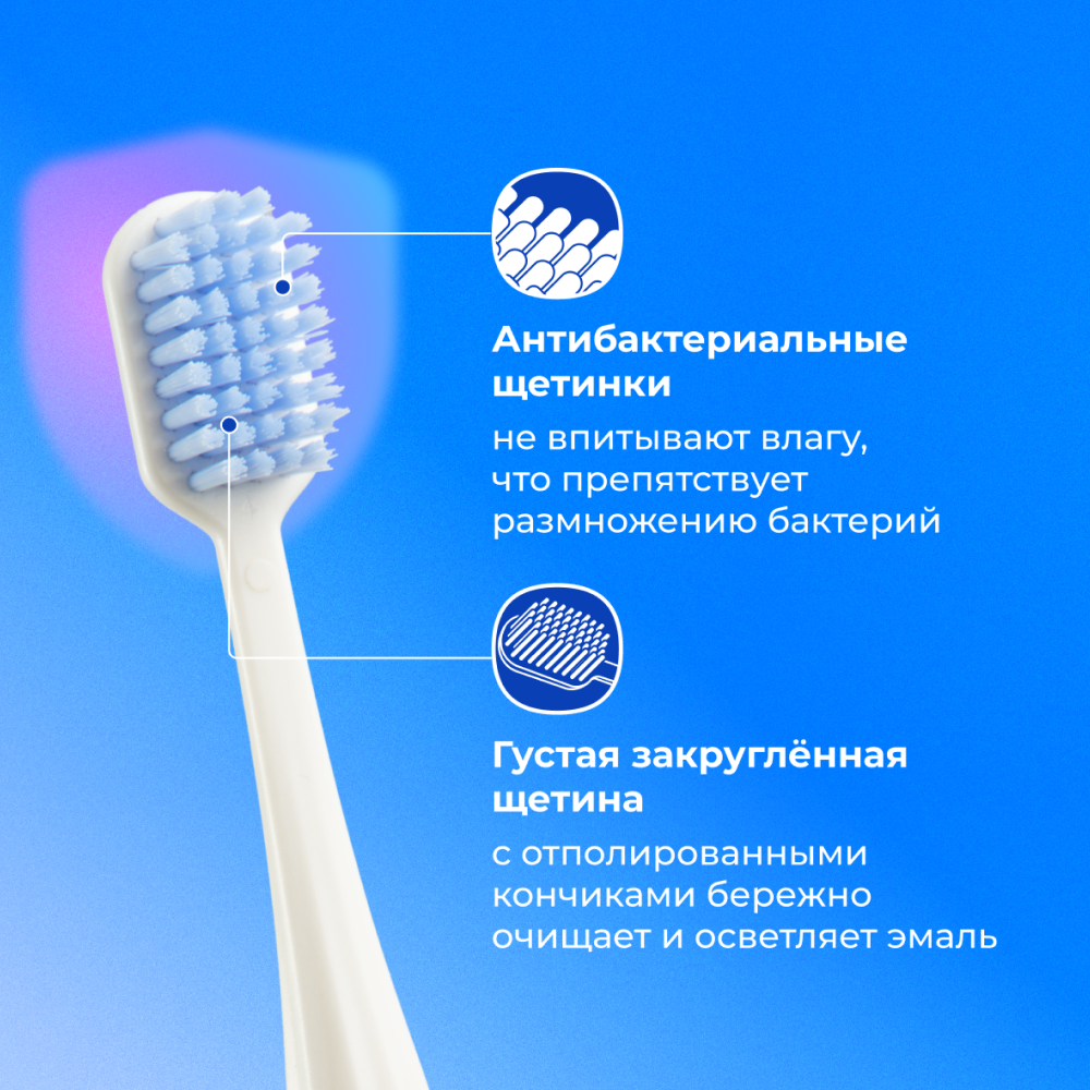 Ручка зубной щетки выполнена из высококачественного гипоаллергенного пластика, не скользит в руке и обладает удобной эргономичной формой.