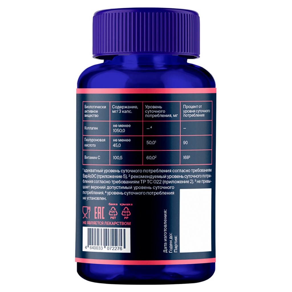 Гидролизат рыбного коллагена, аскорбиновая кислота, антислеживающий агент тальк, гиалуроновая кислота, антислеживающий агент кремния диоксид, капсула (гидроксипропилметилцеллюлоза).