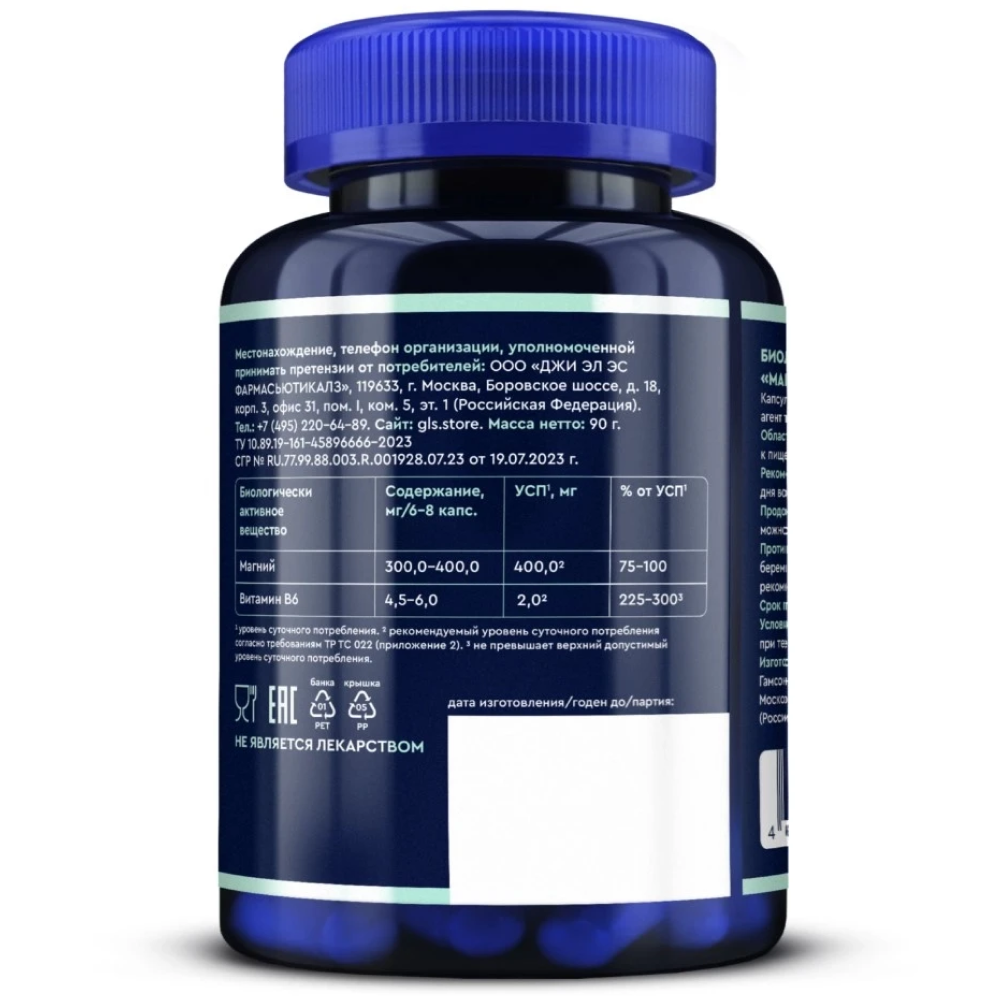 Магния бисглицинат, антислеживающий агент тальк, пиридоксида гидрохлорид, капсула (желатин).