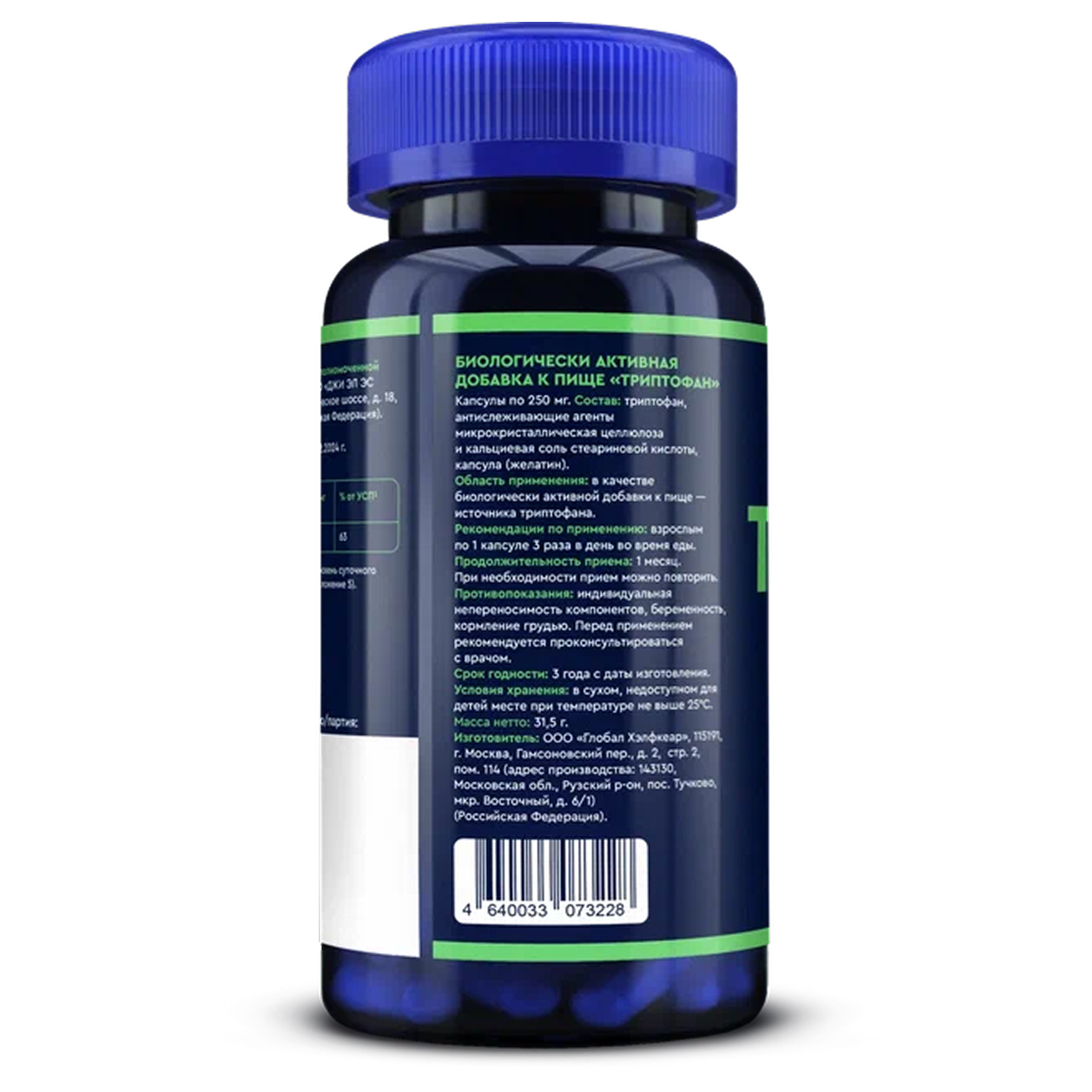 Триптофан. Вспомогательные вещества: антислеживающий агент микрокристаллическая целлюлоза, гидроксипропилметилцеллюлоза.