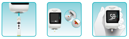 • После появление на дисплее изображения тест-полоски и мигающей капли, нужно прикоснуться желтым краем тест-полоски к капле крови.