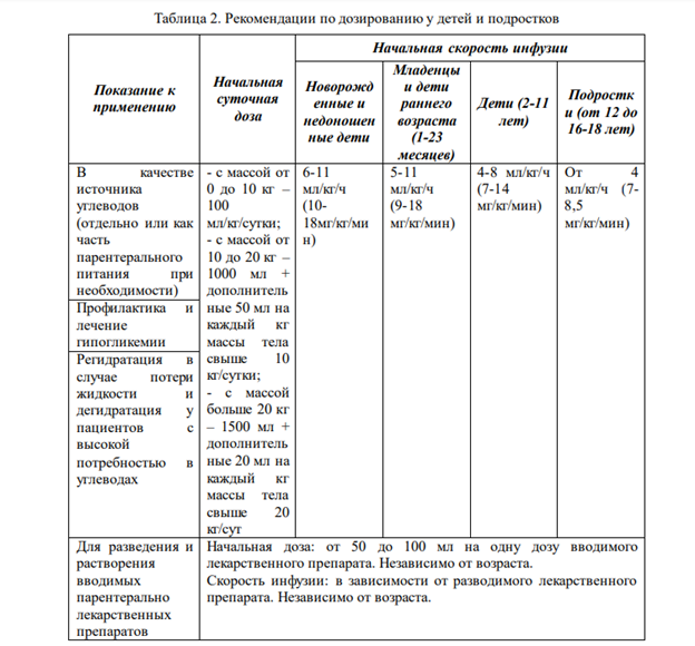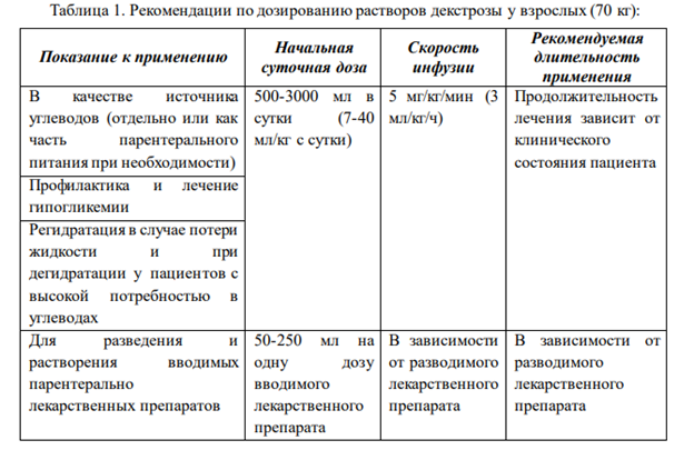 В рамках парентерального питания 5%, 10%, растворы декстрозы вводят в качестве источника углеводов (отдельно или как часть парентерального питания при необходимости).