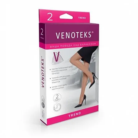 VENOTEKS TREND – эффективно снимают дневные отеки при статических нагрузках (кто много сидит или стоит), уменьшают ночные судороги в ногах (венозного происхождения) и препятствуют дальнейшему прогрессированию  варикозной болезни и развитию её осложнений. Рекомендованы для лечения поражения вен на уровне голени и/или стопы, в том числе у беременных женщин.