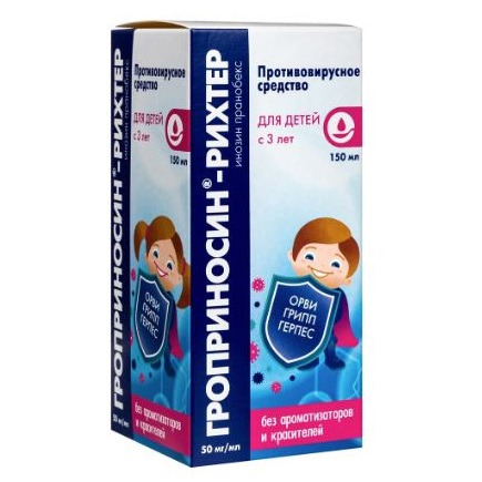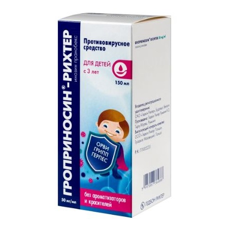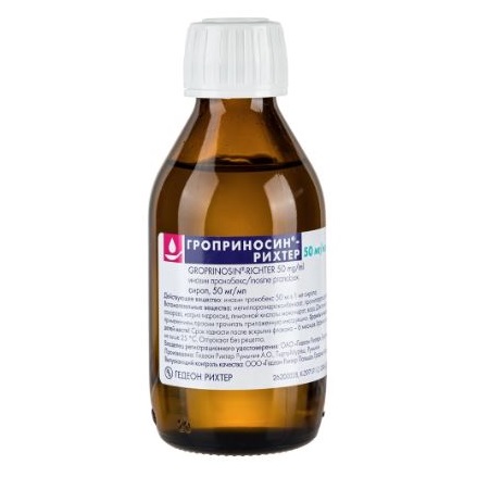 Эффективность комплекса определяется присутствием инозина, второй компонент повышает его доступность для лимфоцитов. Инозин пранобекс блокирует размножение вирусных частиц путем повреждения генетического аппарата, стимулирует активность макрофагов, пролиферацию лимфоцитов и образование цитокинов. Второй компонент повышает доступность препарата Гроприносин®-Рихтер для лимфоцитов. Уменьшает клинические проявления вирусных заболеваний, ускоряет реконвалесценцию, повышает резистентность организма.