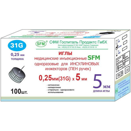 ИГЛЫ МЕДИЦИНСКИЕ ИНЪЕКЦИОННЫЕ ОДНОРАЗОВЫН ДЛЯ ИНСУЛИНОВЫХ ИНЖЕКТОРОВ (ПЕН РУЧЕК) 31G 0,25Х5ММ - последнее поколение одноразовых игл медицинских инъекционных SFM для инсулиновых инжекторов (ПЕН ручек) имеет ряд преимуществ: