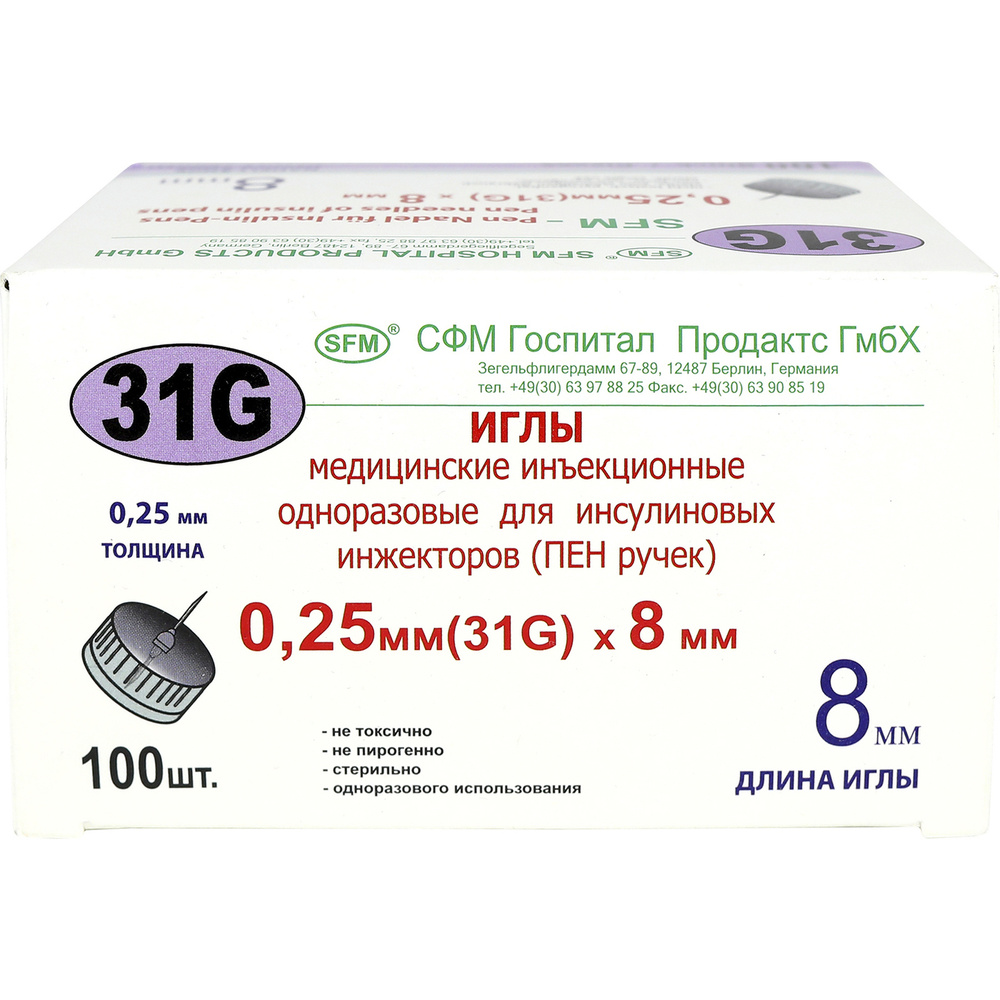 Иглы SFM для шприц ручек для одноразового использования с инсулиновыми инжекторами, для подкожного введения инсулина. Тонкие иглы совместимы со шприц ручками ведущих производителей: Eli Lilly (ХумаПен Эрго, ХумаПен Люксура, Баета), Becton Dickinson (BD Micro-Fine Plus) Novo Nordisk (НовоПен 3, НовоПен 3 Деми, ФлексПен) Sanofi-Aventis (ОптиКлик, ОптиПен Про1).