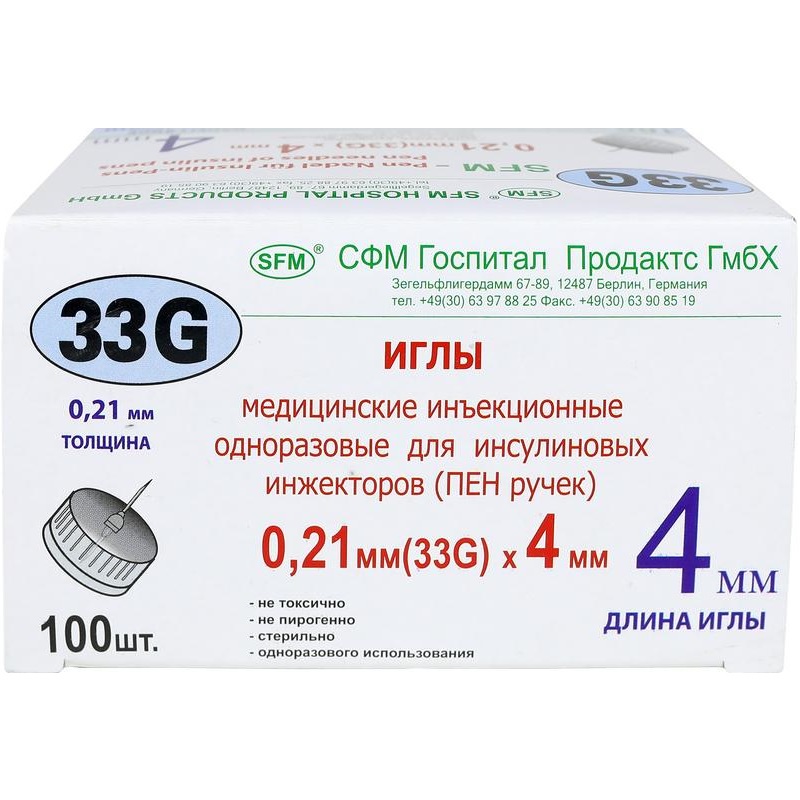Иглы SFM для шприц ручек для одноразового использования с инсулиновыми инжекторами, для подкожного введения инсулина. Тонкие иглы совместимы со шприц ручками ведущих производителей: Eli Lilly (ХумаПен Эрго, ХумаПен Люксура, Баета), Becton Dickinson (BD Micro-Fine Plus) Novo Nordisk (НовоПен 3, НовоПен 3 Деми, ФлексПен) Sanofi-Aventis (ОптиКлик, ОптиПен Про1). Иглы короткой длины (4-6 мм) подходят для детей и людей с худым телосложением. Иглы средней длины (6-8 мм) предназначены для инъекций, которые выполняются в кожную складку под углом 90°, подходят для подростков и людей с худым телосложением. Длинные иглы (более 8 мм) используют для инъекций, которые выполняются в кожную складку под углом 45°, подходят взрослых людей крупного телосложения. Одноразовые иглы для инсулиновых инжекторов стерильные, нетоксичные, апирогенные, с уникальной тонкостенной технологией иглы с увеличенным просветом.