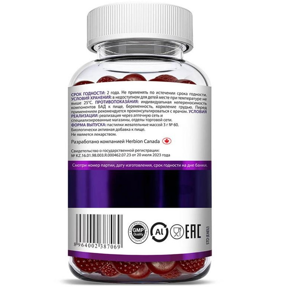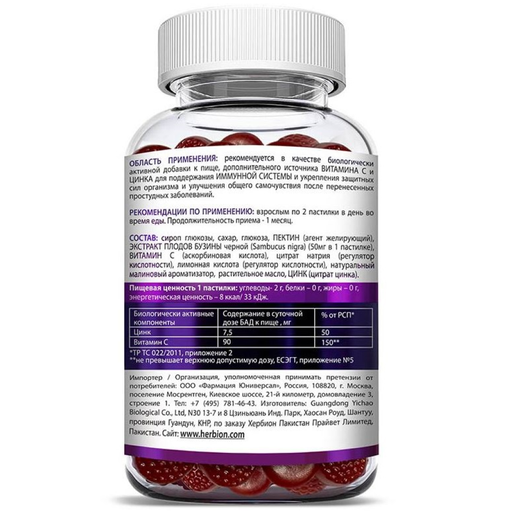 Сироп глюкозы, сахар, глюкоза, экстракт плодов БУЗИНЫ черной (50 мг в 1 пастилке), ВИТАМИН С, цитрат натрия, лимонная кислота, натуральный малиновый ароматизатор, масло растительное, ЦИНК.