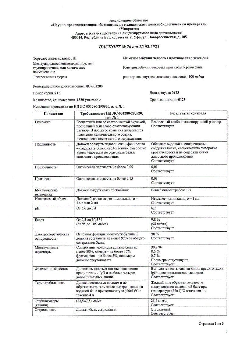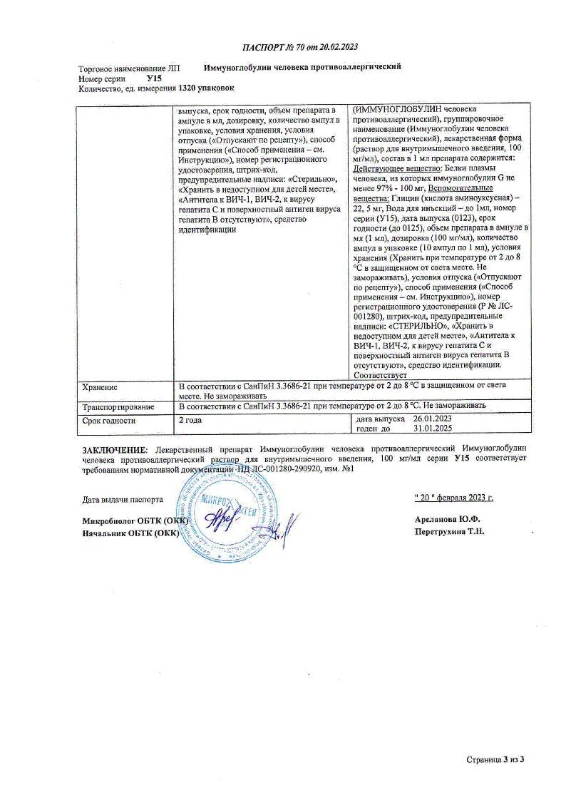 Действующим началом препарата являются иммуноглобулины класса G, оказывающие выраженное противоаллергическое действие при аллергических заболеваниях немедленного (атопического) типа.