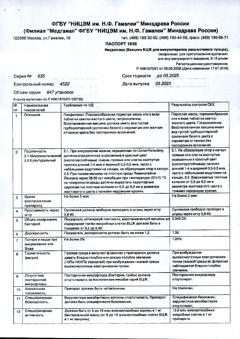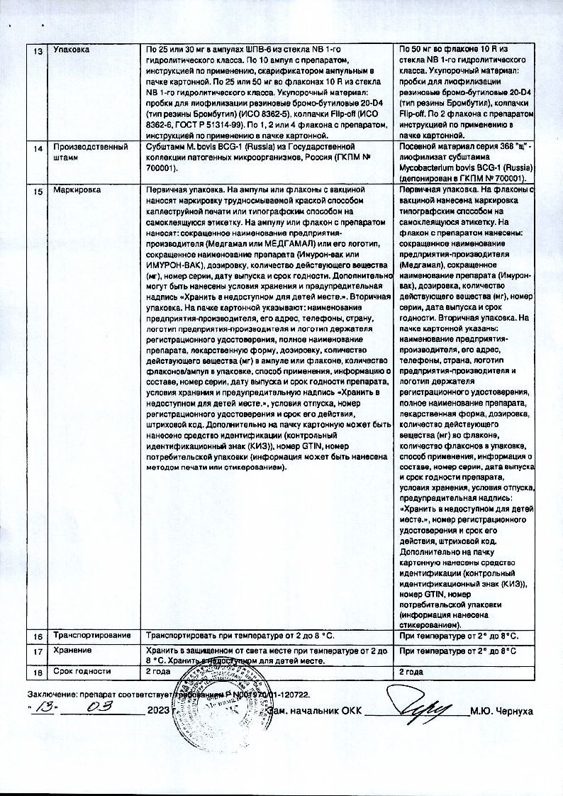 Имурон-вак представляет собой культуру микробных клеток вакцинного штамма БЦЖ-1 (М.bovis ВСG -1, Russia), лиофилизированную в 1,5 % растворе натрия глутамата моногидрата.