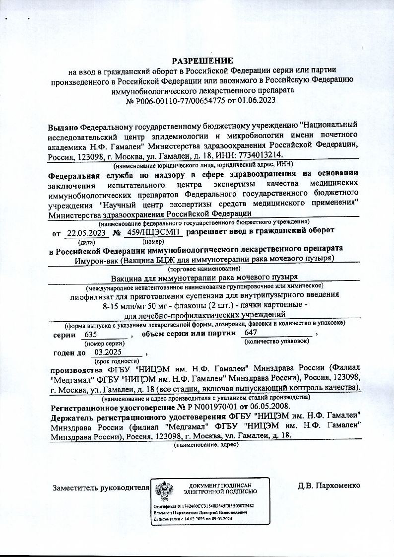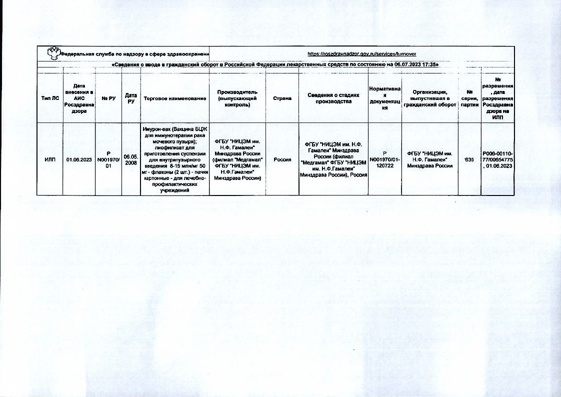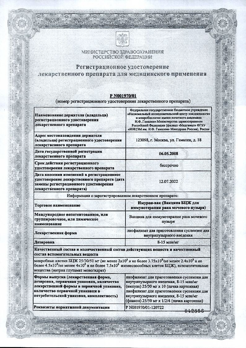 Препарат предназначен для иммунотерапии поверхностного (Та, Тl, Тis) рака мочевого пузыря или профилактики его рецидивов после трансуретрального удаления опухолей.