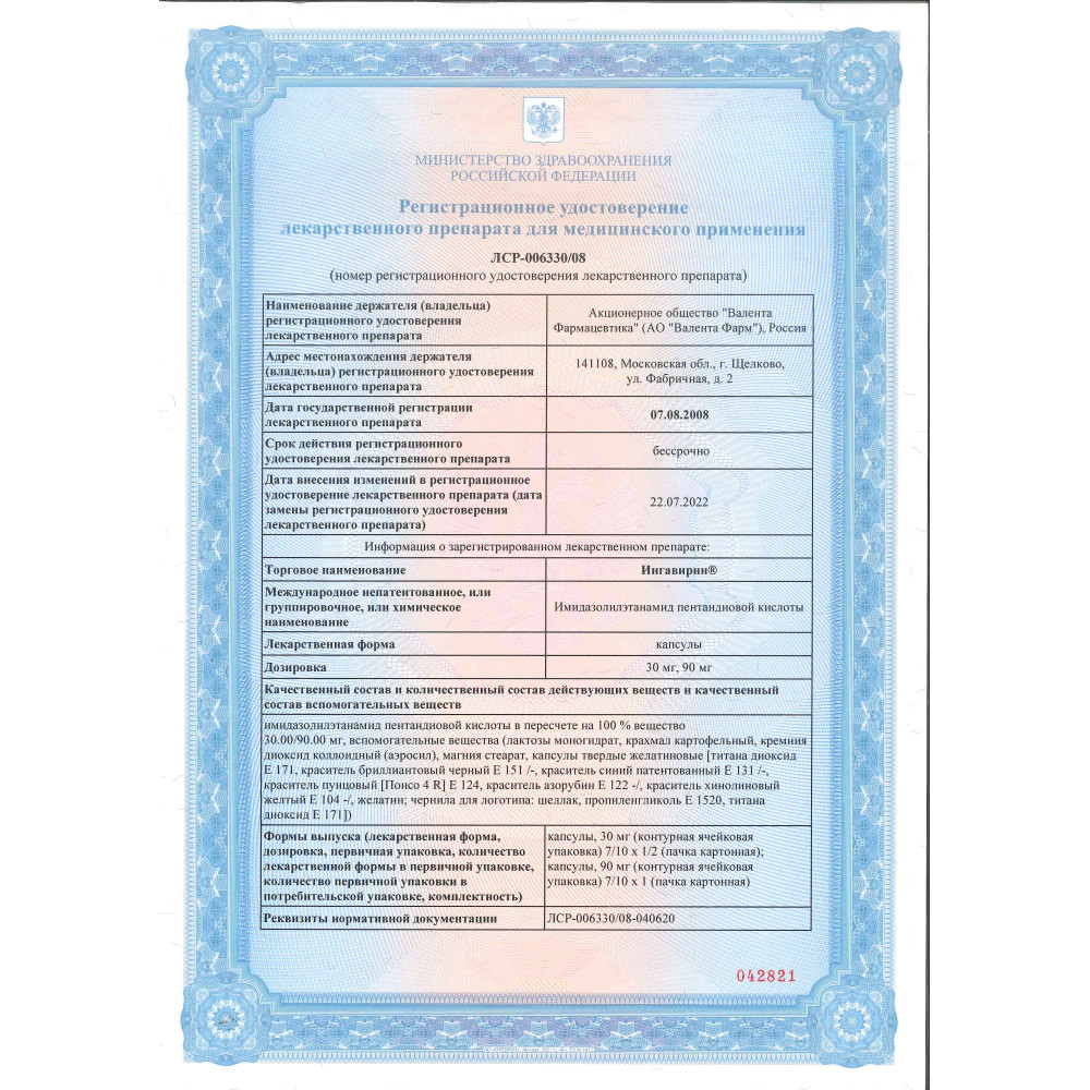 Механизм действия реализуется на уровне инфицированных клеток за счет стимуляции факторов врожденного иммунитета, подавляемых вирусными белками. В экспериментальных исследованиях, в частности, показано, что препарат Ингавирин® повышает экспрессию рецептора интерферона первого типа IFNAR на поверхности эпителиальных и иммунокомпетентных клеток. Увеличение плотности интерфероновых рецепторов приводит к повышению чувствительности клеток к сигналам эндогенного интерферона. Процесс сопровождается активацией (фосфорилированием) белка-трансмиттера STAT1, передающего сигнал в ядро клетки для индукции противовирусных генов. Показано, что в условиях инфекции препарат стимулирует выработку антивирусного эффекторного белка МхА, ингибирующего внутриклеточный транспорт рибонуклеопротеидов различных вирусов, замедляя процесс вирусной репликации.
