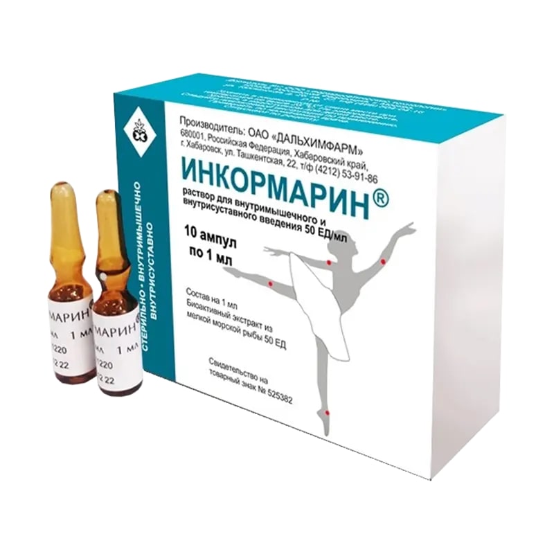 Лекарственный препарат Инкормарин® предотвращает разрушение макромолекулярных структур нормальных тканей, стимулирует процессы восстановления в интерстициальной ткани и ткани суставного хряща, что объясняет его обезболивающее действие.