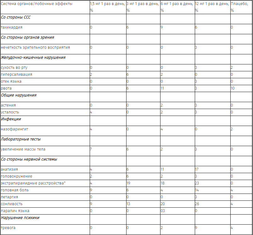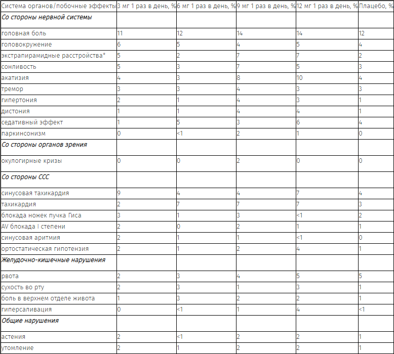 * Экстрапирамидные расстройства включают: окулогирный криз, мышечная ригидность, скелетно-мышечная ригидность, скованность в затылке, кривошея, тризм, брадикинезия, зубчатое колесо жесткости, дискинезия, дистония, экстрапирамидные расстройства, гипертония, гипокинезия, непроизвольные мышечные сокращения, паркинсонизма походки, паркинсонизм, тремор и беспокойство. Сонливость включает в себя сонливость седативный эффект и гиперсомнию. Бессонница включает в себя бессонницу и начальную бессонницу. Тахикардия включает в себя тахикардию, синусовую тахикардию, и увеличение частоты сердечных сокращений. Гипертония включает гипертонию и повышение кровяного давления.
