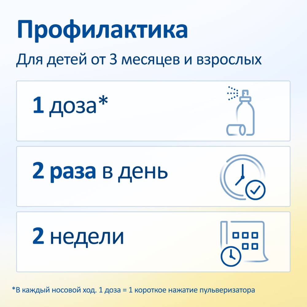 - В целях профилактики взрослым и детям с 3-х месяцев по 1 дозе препарата в каждый носовой ход 2 раза в день в течение 2-х недель (начинать курс лечения рекомендуется за 2-3 недели до ожидаемого подъема заболеваемости);