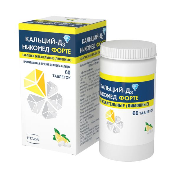 Действующие вещества: кальция карбонат - 1250 мг (эквивалентно элементарному кальцию - 500 мг), колекальциферол (витамин D3) - 10,0 мкг* (400 МЕ) в виде концентрата** колекальциферола - 4,0 мг*.