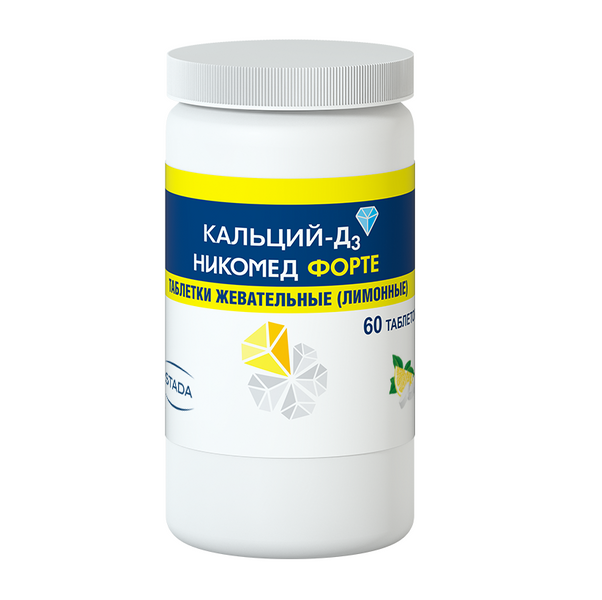 Активное вещество: кальция карбонат 1250 мг, эквивалентно элементарному кальцию 500 мг; колекальциферол (вит. D3) 10 мкг* (400 МЕ) в виде концентрата** колекальциферола 4 мг*.